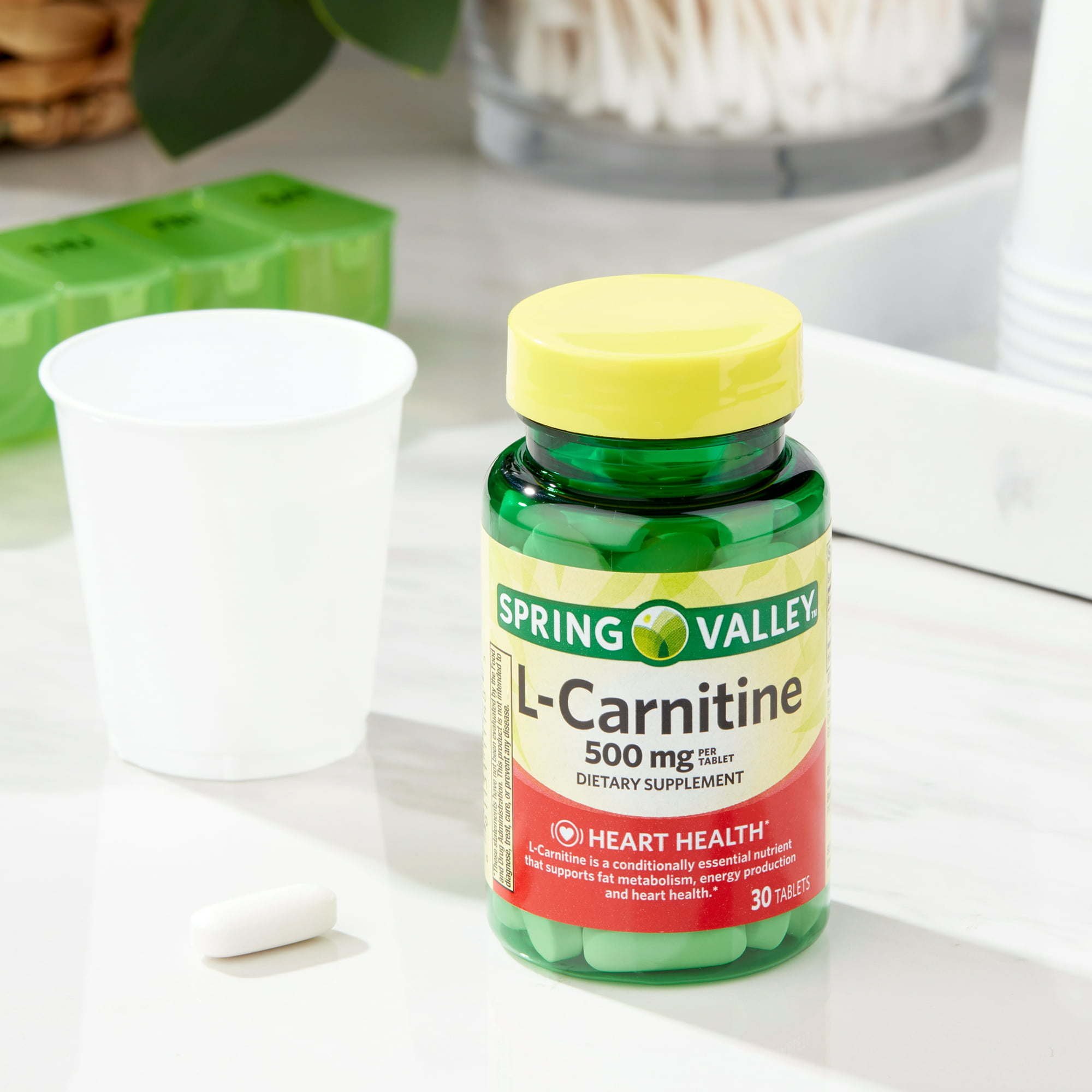 Spring Valley L-Carnitine Dietary Supplement; 500 mg is a dietary supplement formulated to support heart health. L-carnitine is a conditionally essential nutrient that supports fat metabolism; energy production and heart health. The suggested adult dosage is one tablet; four times daily; preferably with a meal. You can rest assured that Spring Valley L-Carnitine Dietary Supplement; 500 mg; is produced with strict quality guidelines and is backed by a quality guarantee; making it a smart choice for your dietary supplement needs.