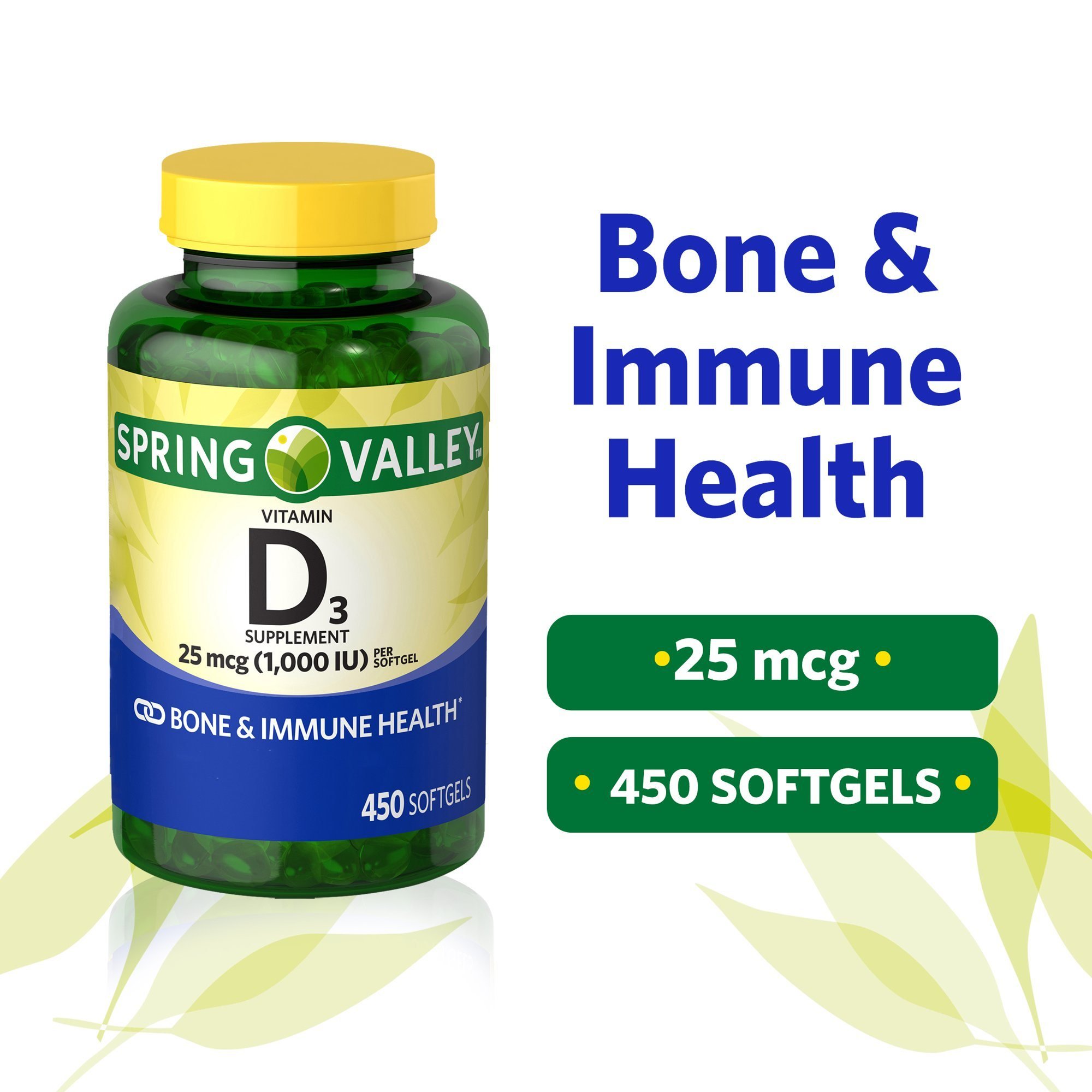 Welcome the Vitamin D you need every day with the Spring Valley Vitamin D3 1; 000 IU Vitamin Supplement. D3 is a potent and active form of Vitamin D; which is essential for calcium absorption; bone health; immune health and healthy teeth.* The human body can produce Vitamin D3 naturally; when the skin is directly exposed to sunlight. Even though the sun can be a great source of the D3 Vitamin; for various reasons; it may be difficult for people to get an adequate amount from the sun alone. Spring Valley Vitamin D3 softgels are an easy and reliable way to help fulfill your daily needs.* These Vitamin D supplements are gluten free; dairy free and non-GMO. Spring Valley D3 Vitamins contain no artificial colors or flavors. Spring Valley understands living a healthy; balanced lifestyle is the key to being your best self. With an affordable range of products inspired by nature; Spring Valley supports your and your family's health and holistic wellbeing. Adults should take one Vitamin D3 25 mcg softgel bone supplement daily; preferably with a meal. *These statements have not been evaluated by the Food and Drug Administration. This product is not intended to diagnose; treat; cure or prevent any disease.