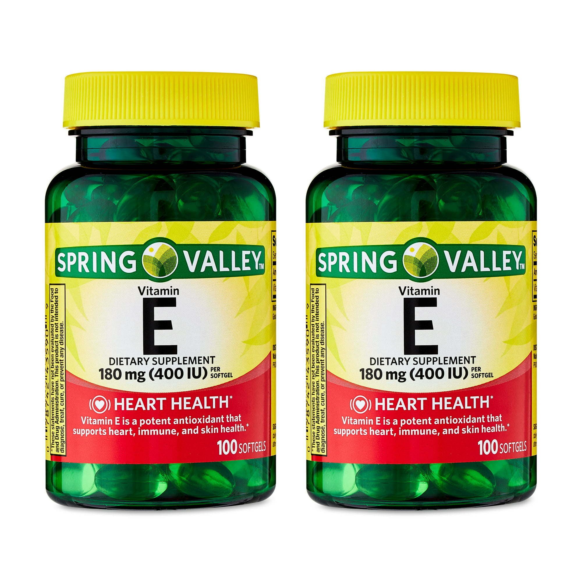 Spring Valley Vitamin E Dietary Supplement Twin Pack; 180 mg is a dietary supplement that promotes heart health. Vitamin E is a potent antioxidant that may support heart; immune; and skin health. This supplement contains no gluten; lactose; added preservatives; added colors; flavors; or salt. The recommended dosage is 1 softgel per day with a full glass of water; preferably after a meal. This twin pack contains two bottles with 100 softgels in each. You can rest assured that our Spring Valley Vitamin E Dietary Supplement Twin Pack; 180 mg is produced with strict quality guidelines and is backed by our quality guarantee.